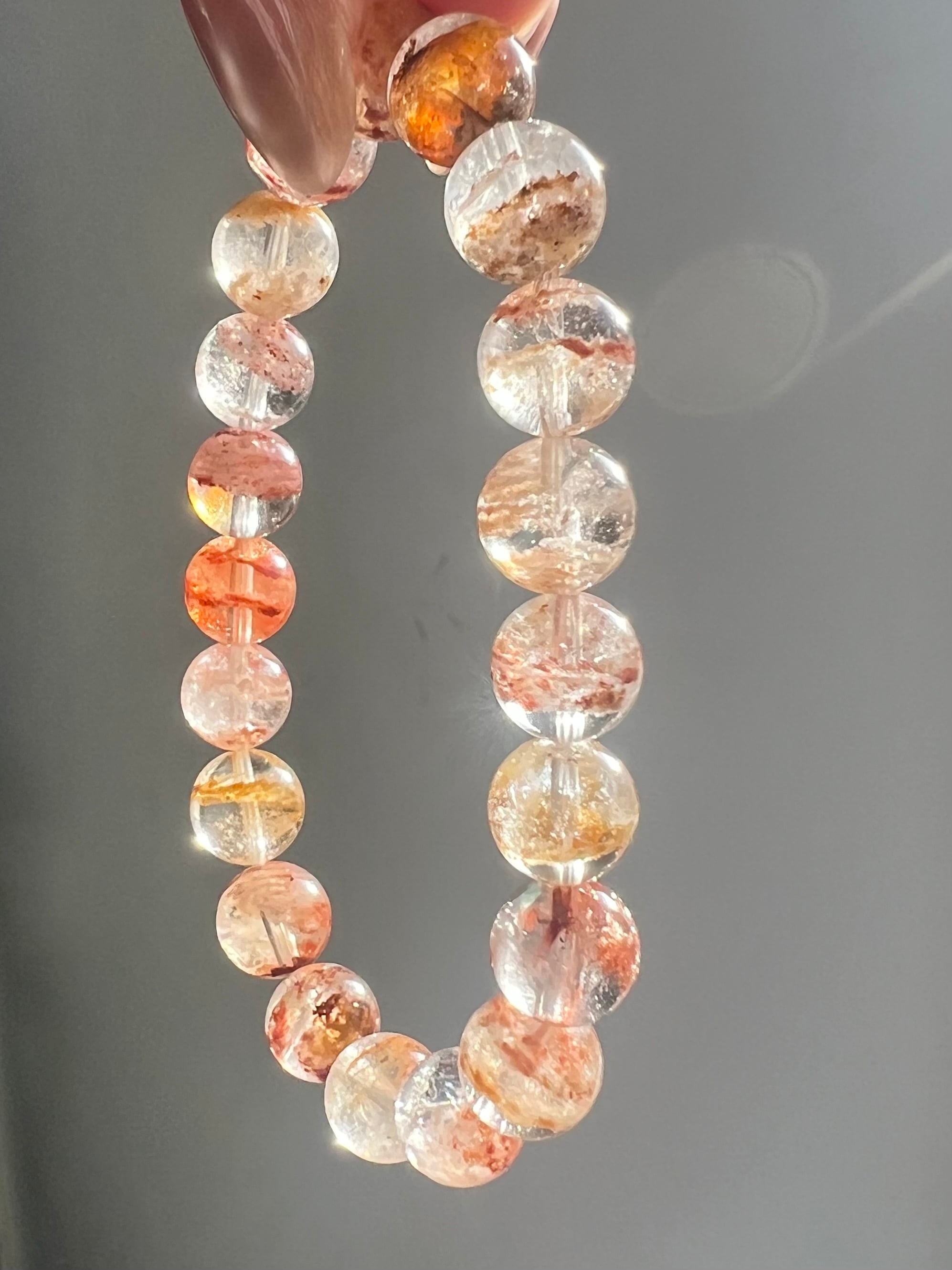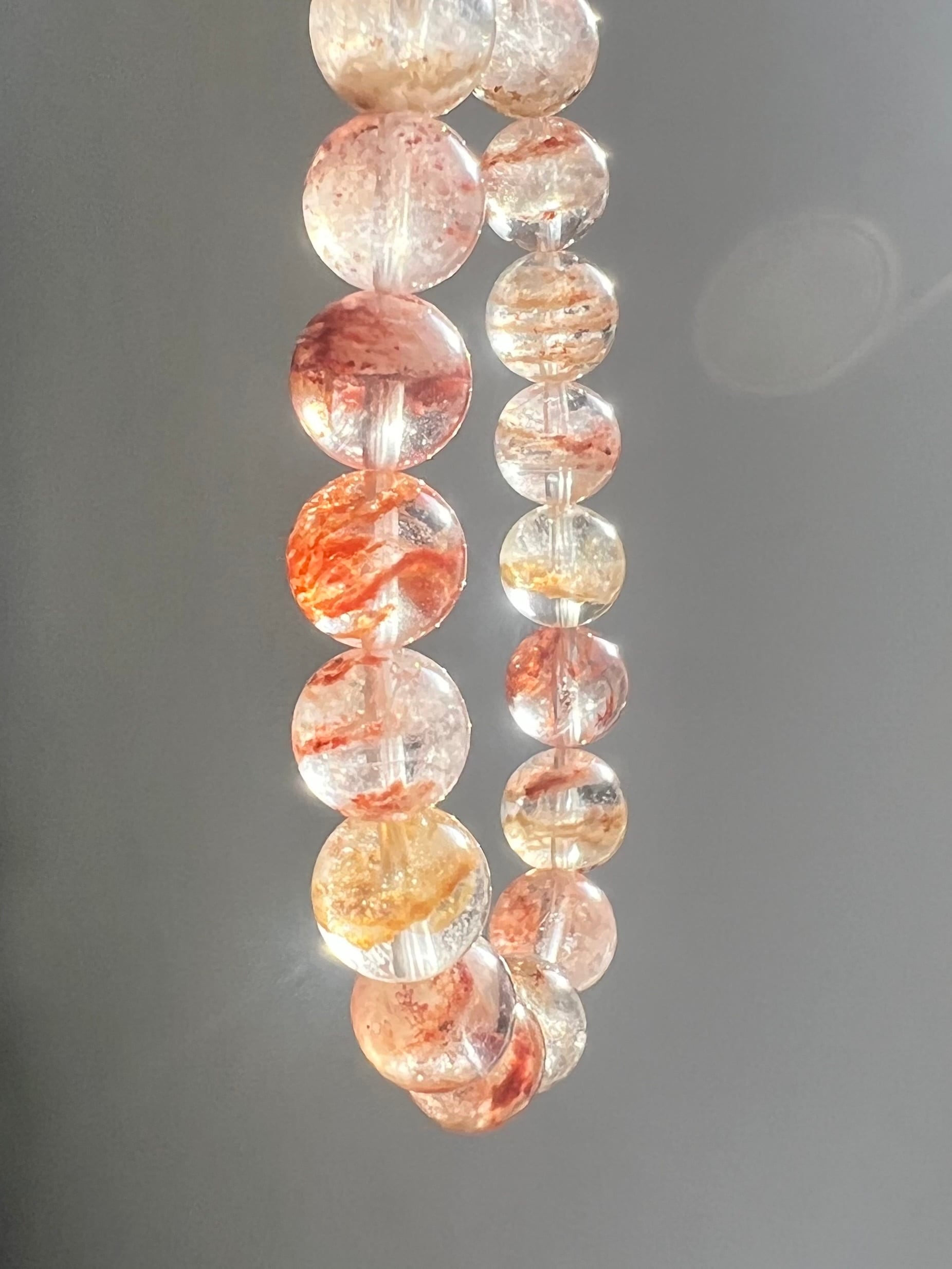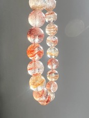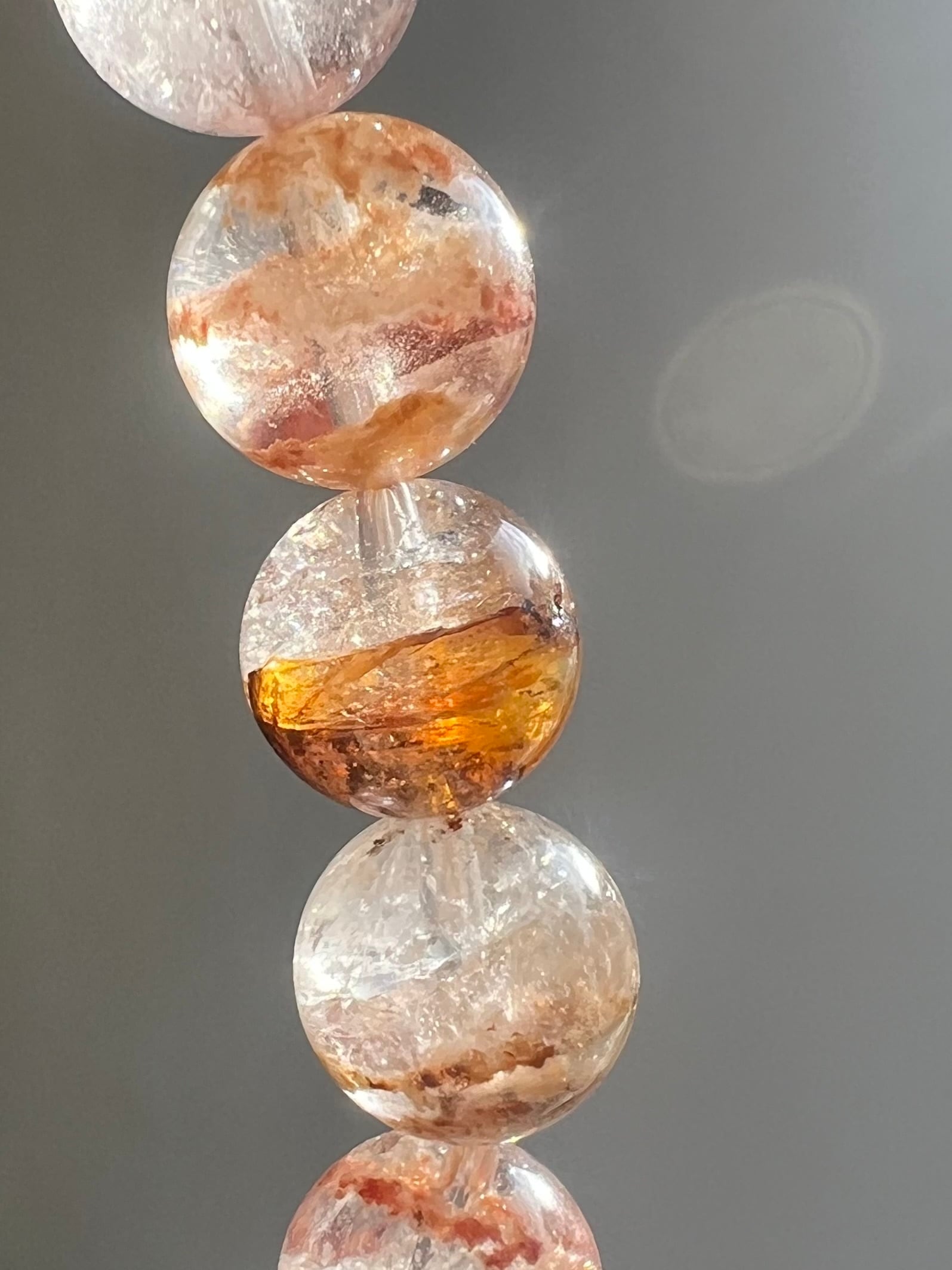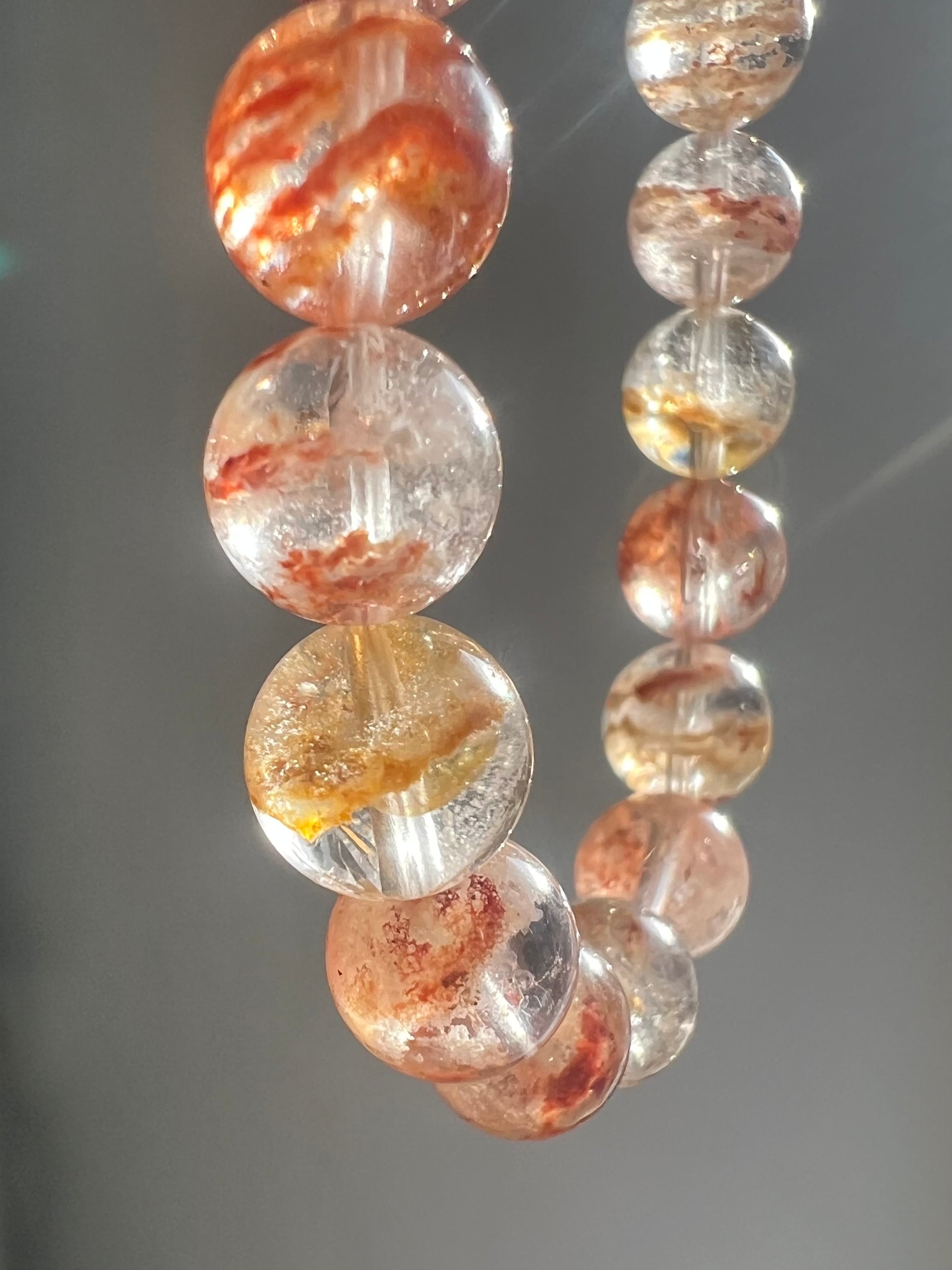 秋の紅葉を思わせるような赤や金の内包物が広がるガーデンクォーツさんෆ