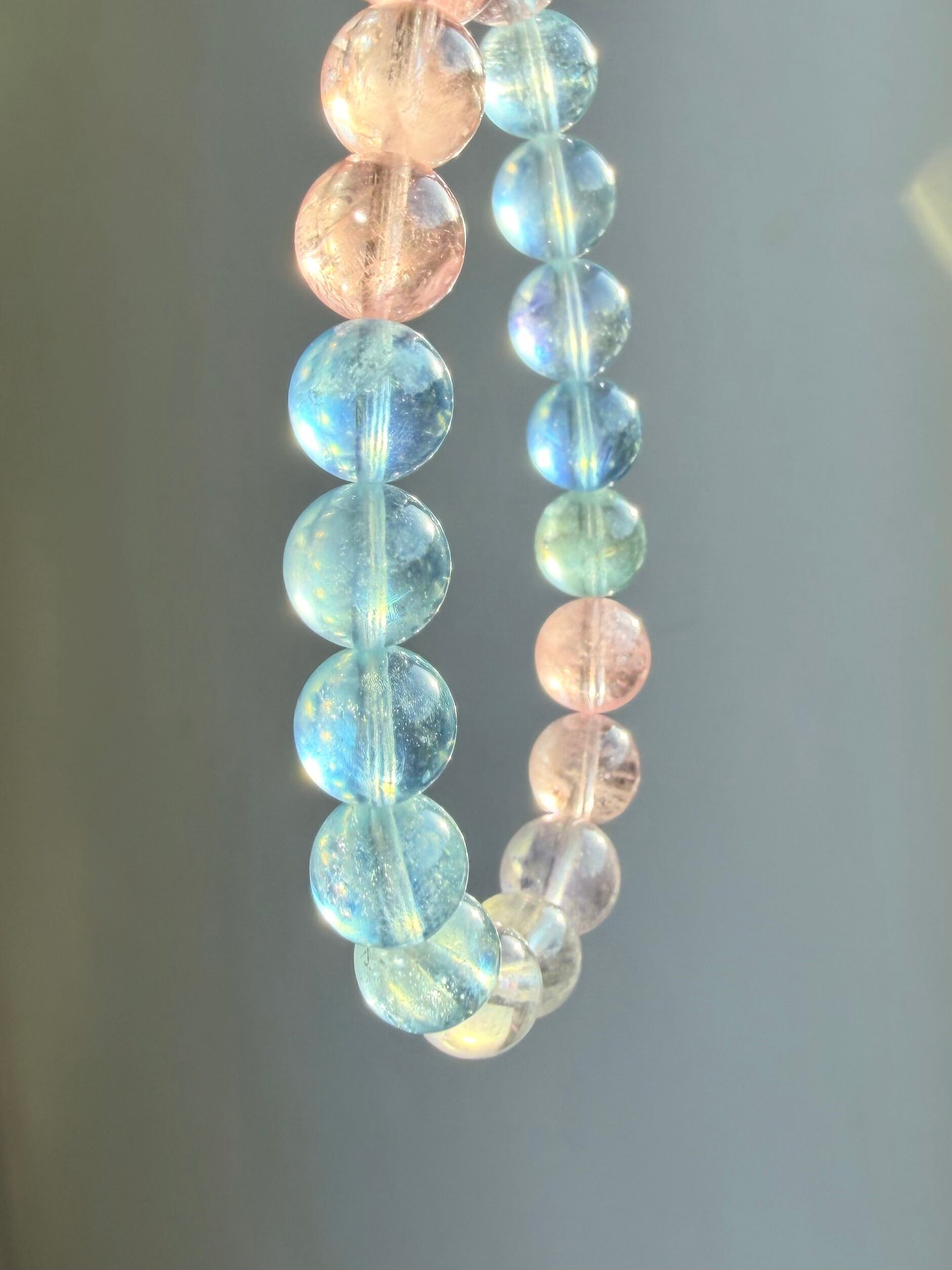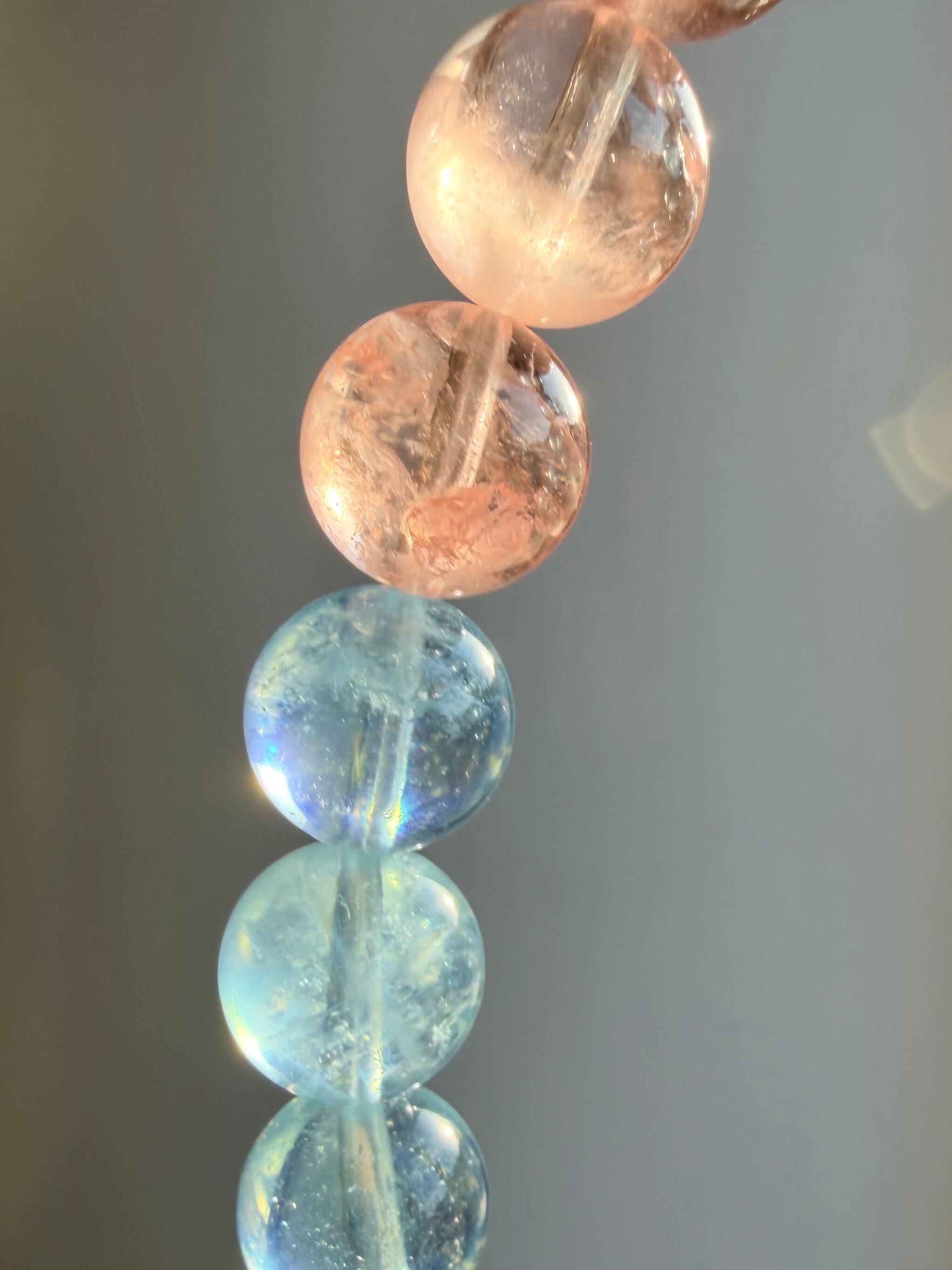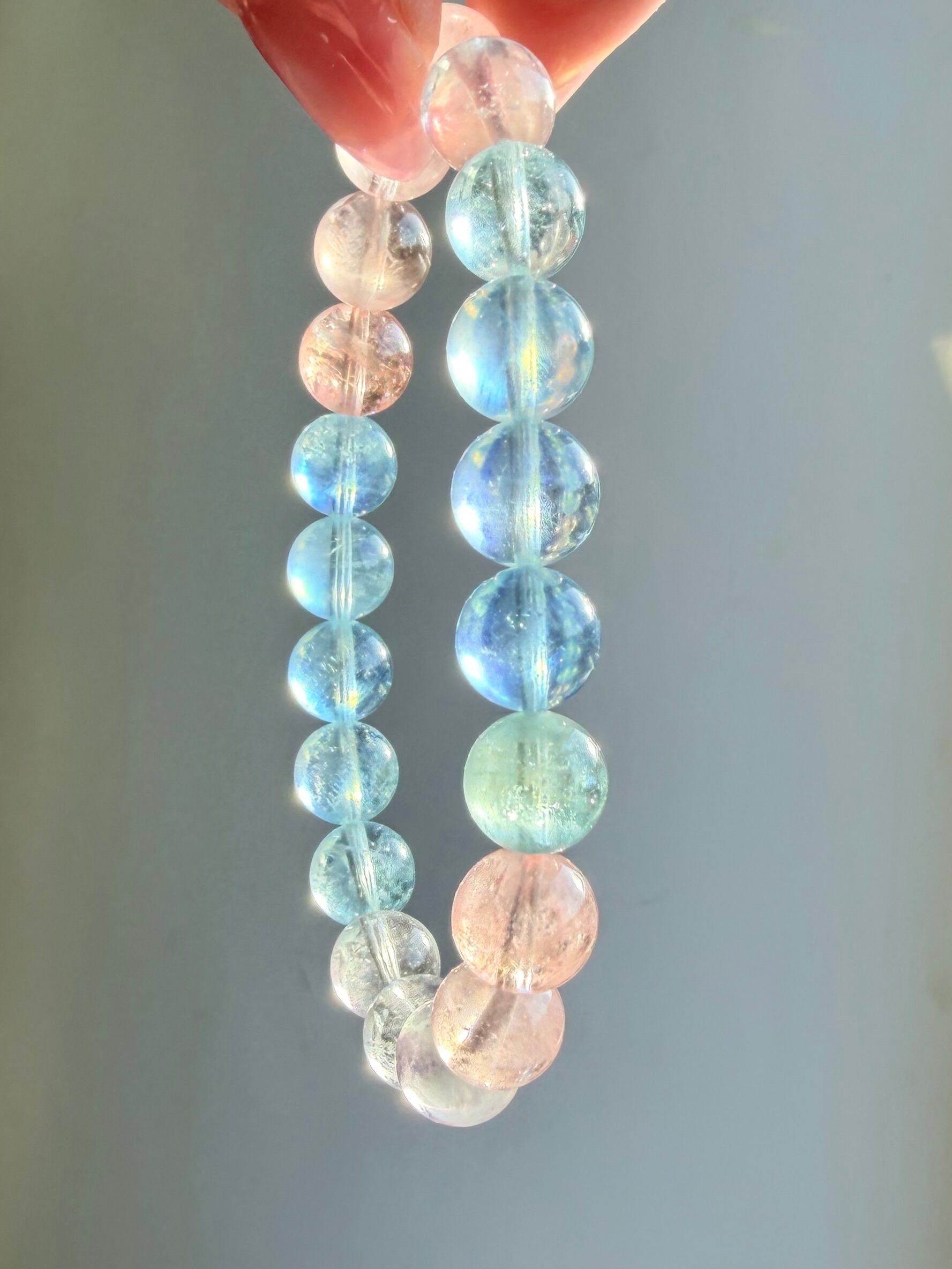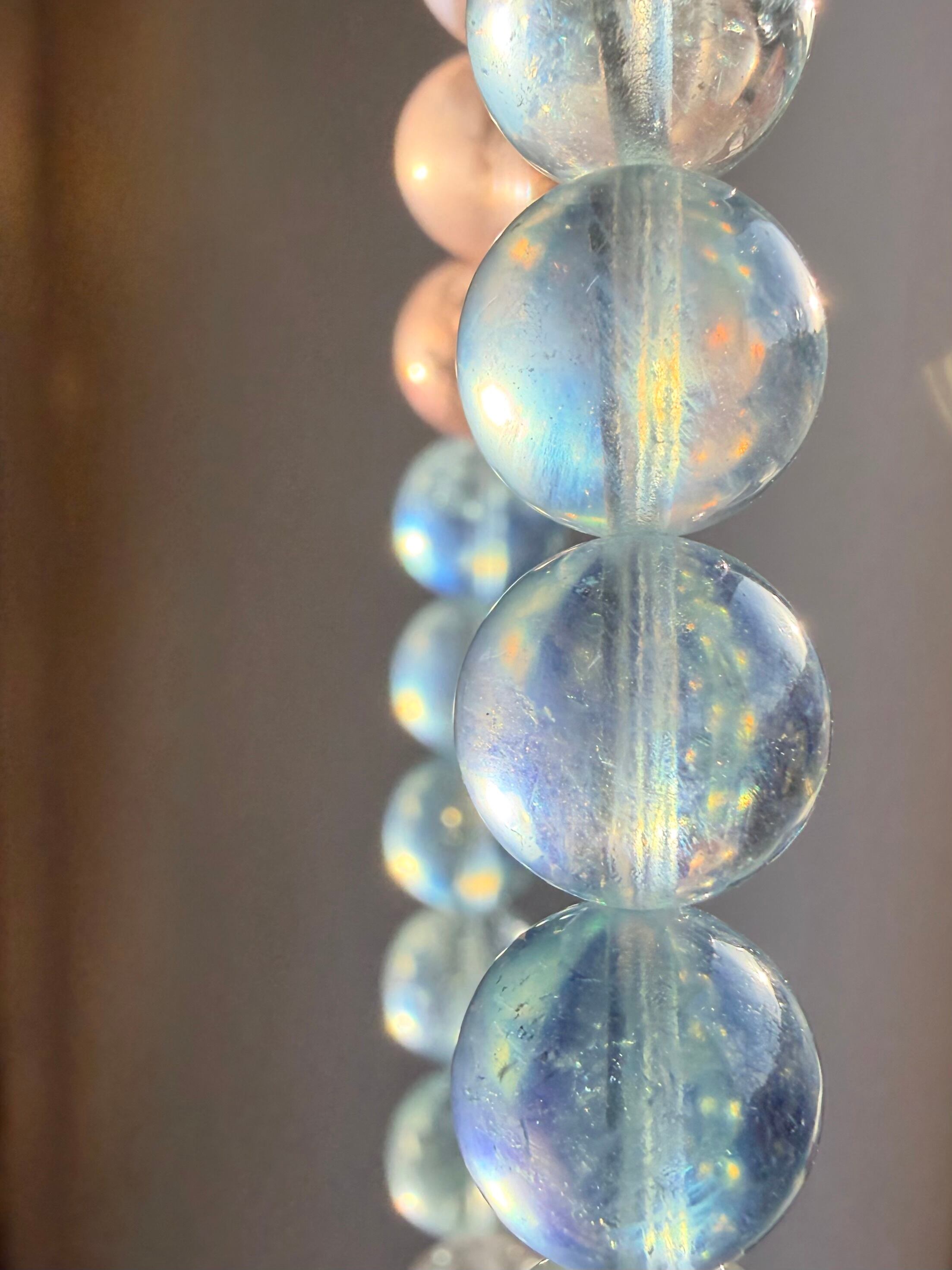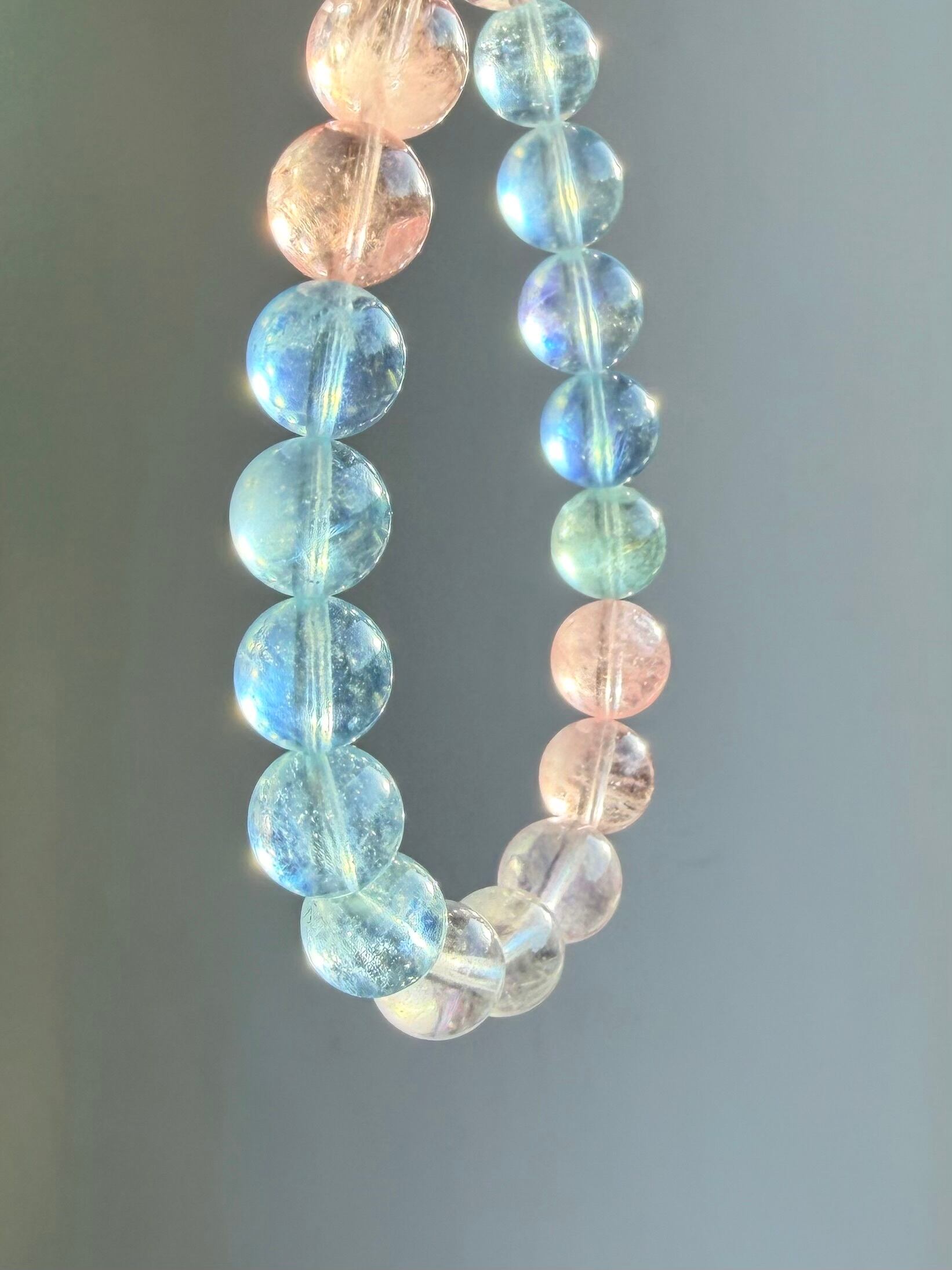 今回のブレスレットは、透明感のある珠に加え、光によってシラーが確認できる珠も含まれた美しいミックスタイプ。