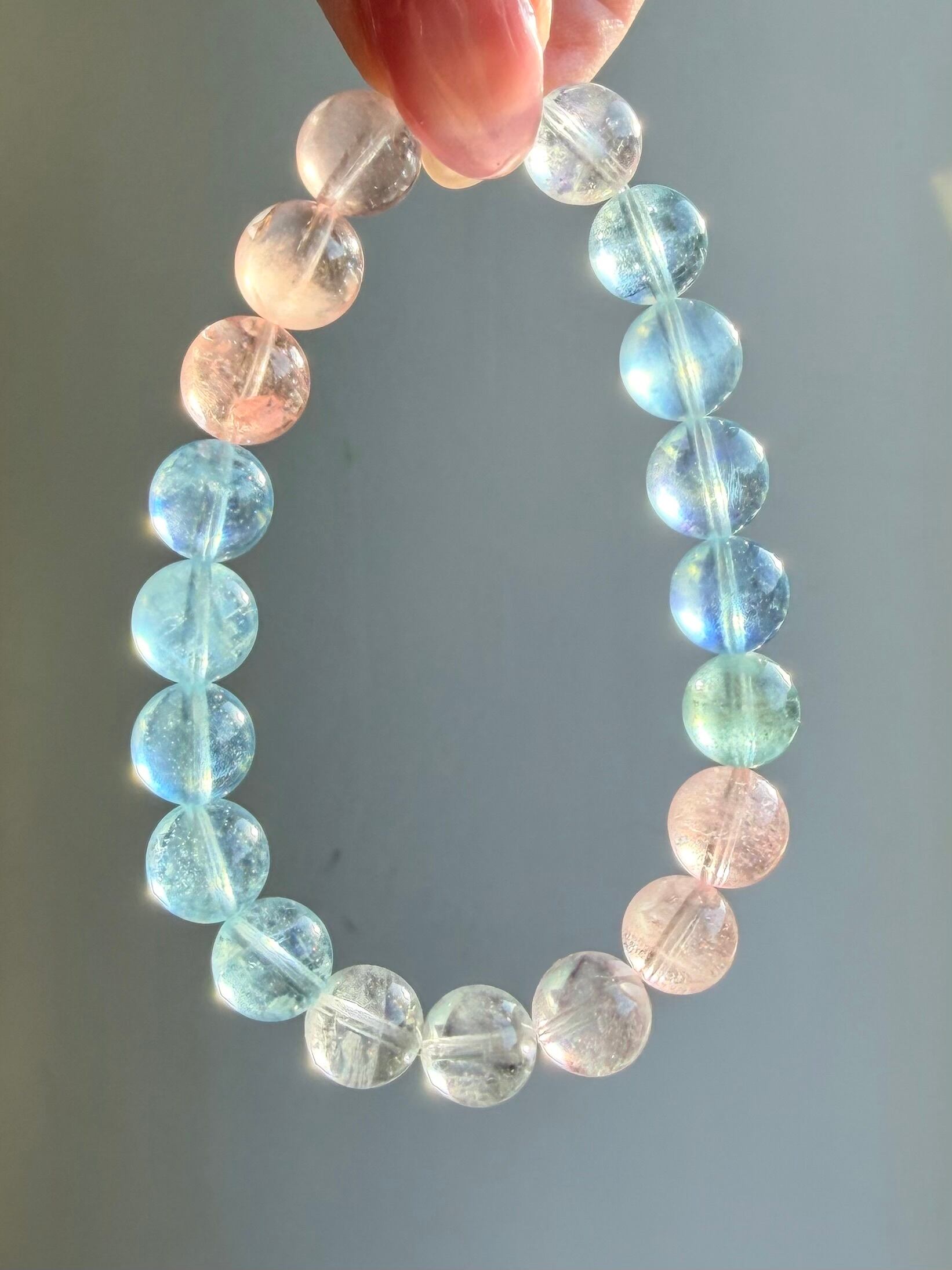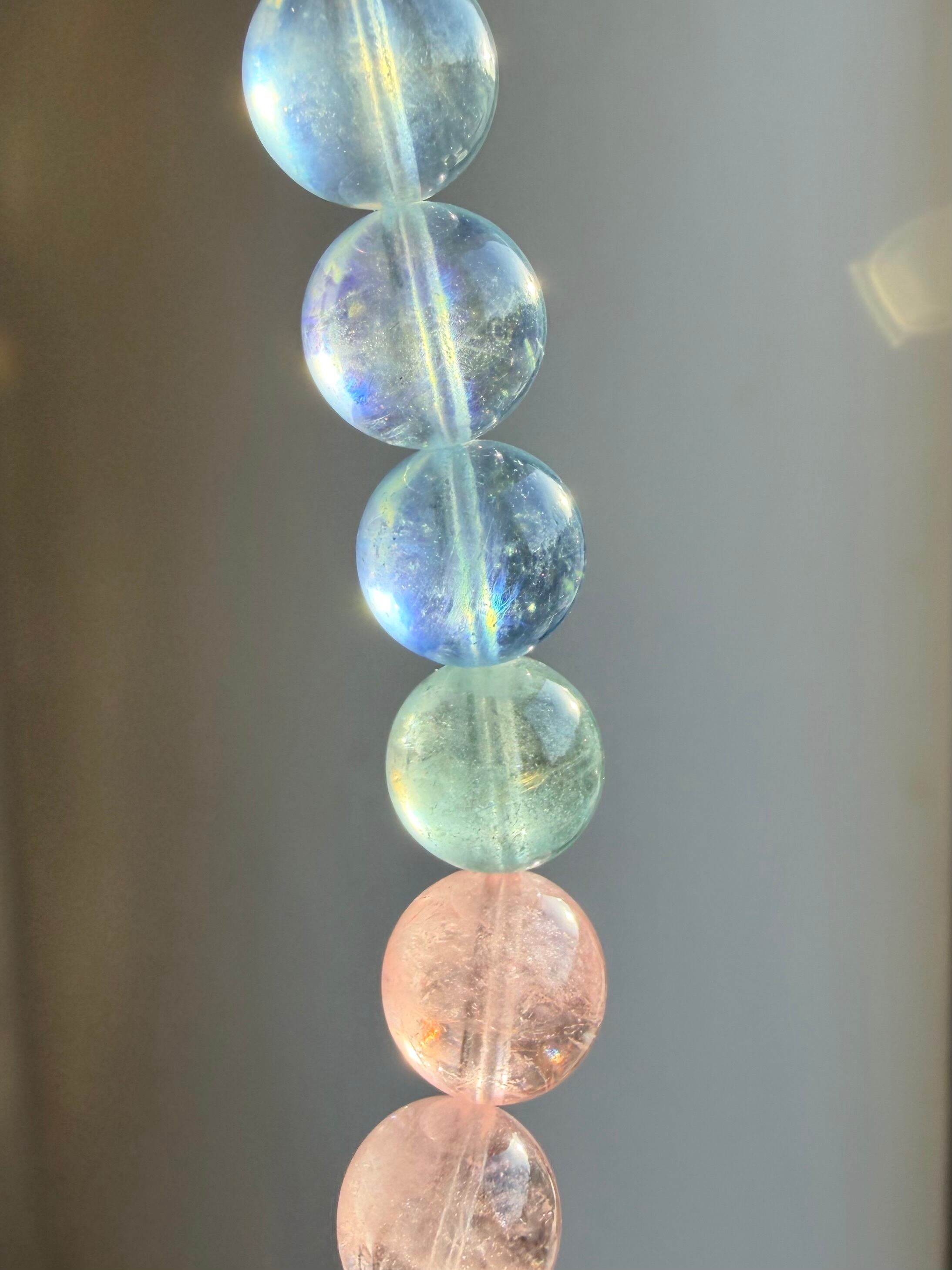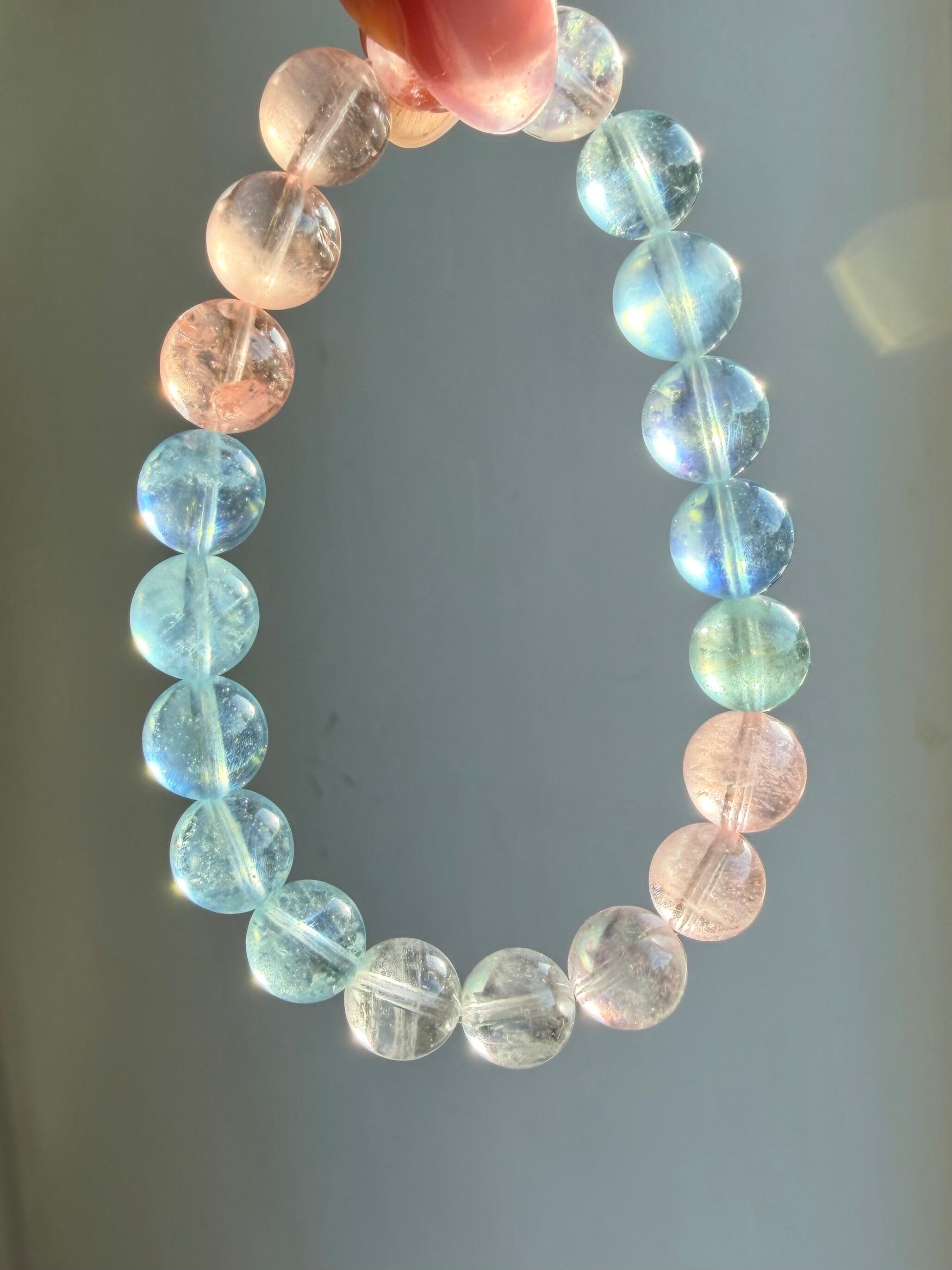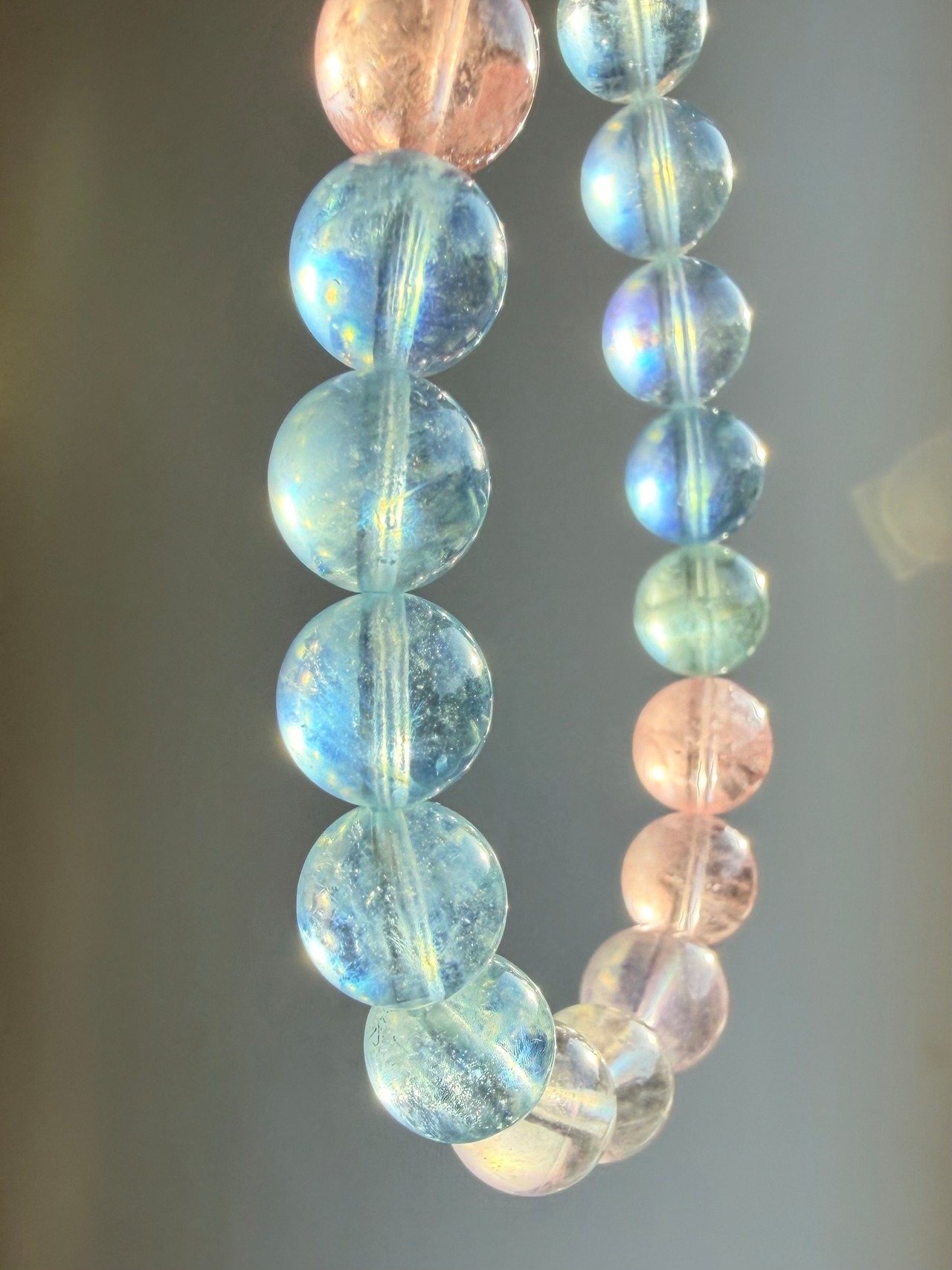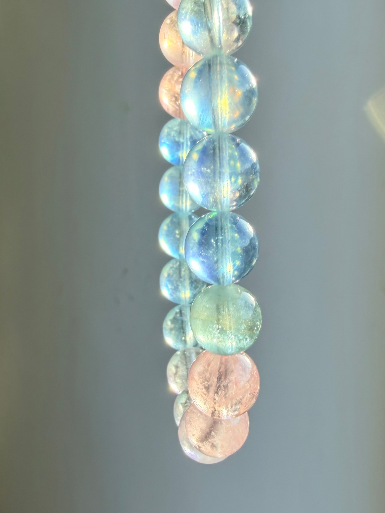 今回のブレスレットは、透明感のある珠に加え、光によってシラーが確認できる珠も含まれた美しいミックスタイプ。