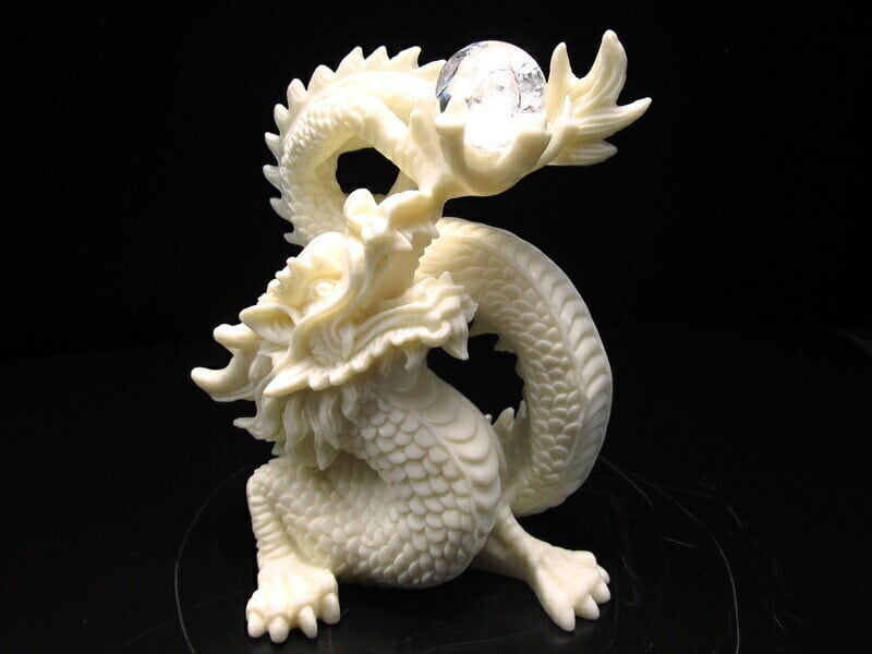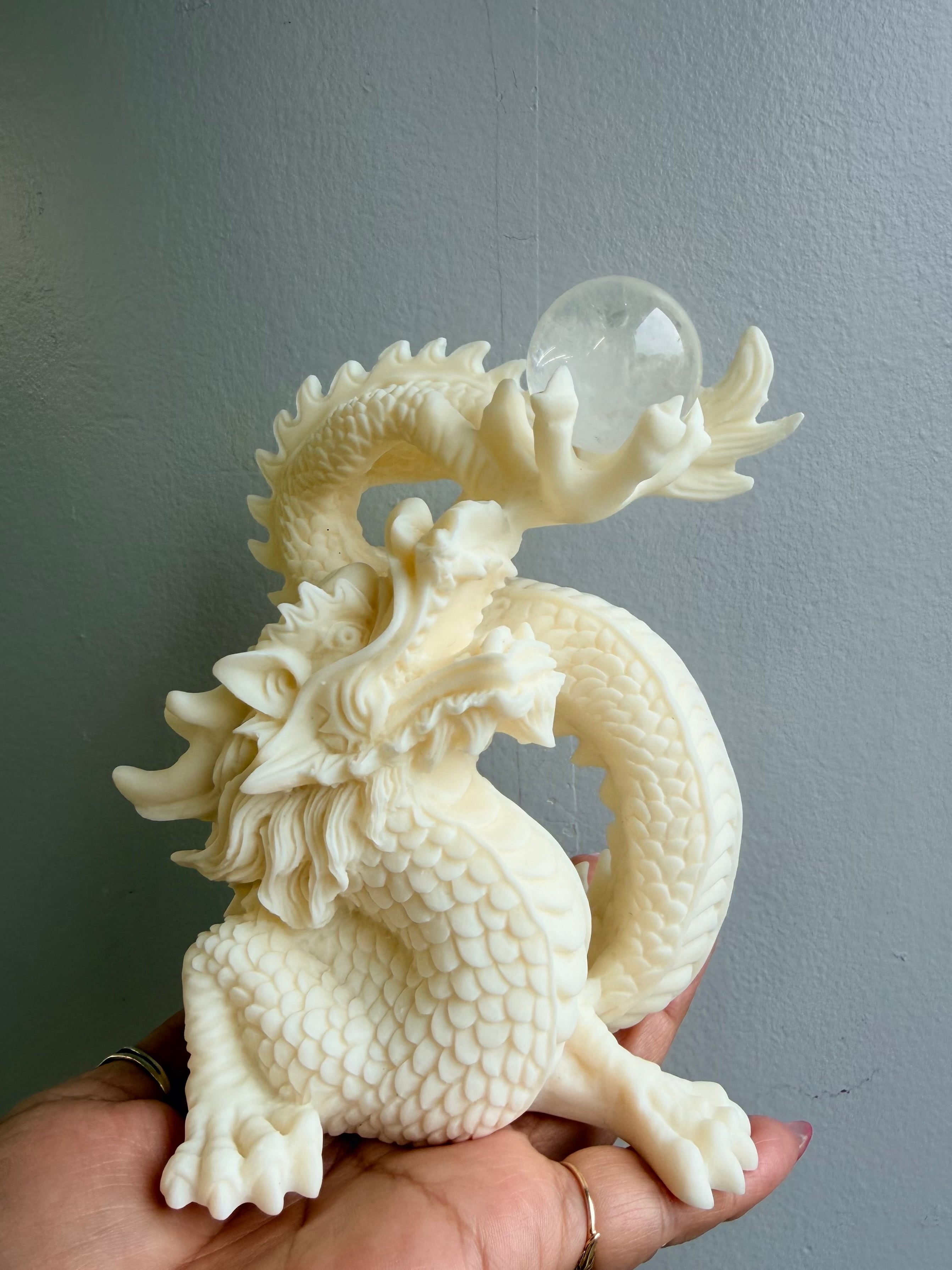 手に抱く水晶の龍玉は、浄化と増幅の象徴。水晶は場のエネルギーを整え、持ち主の意図や願いをクリアにし、拡大させる石とされます。龍と水晶が組み合わさることで、「氣の流れを整えながら運を上昇させる」象徴的なインテリアとして親しまれています。